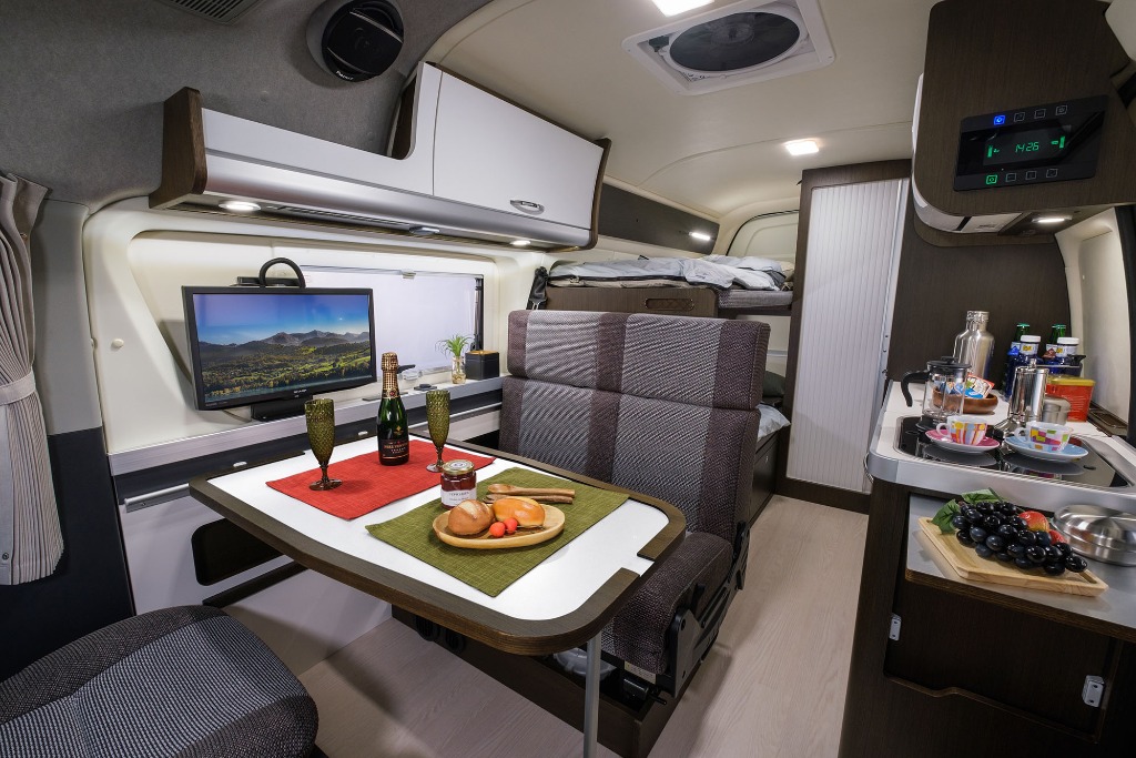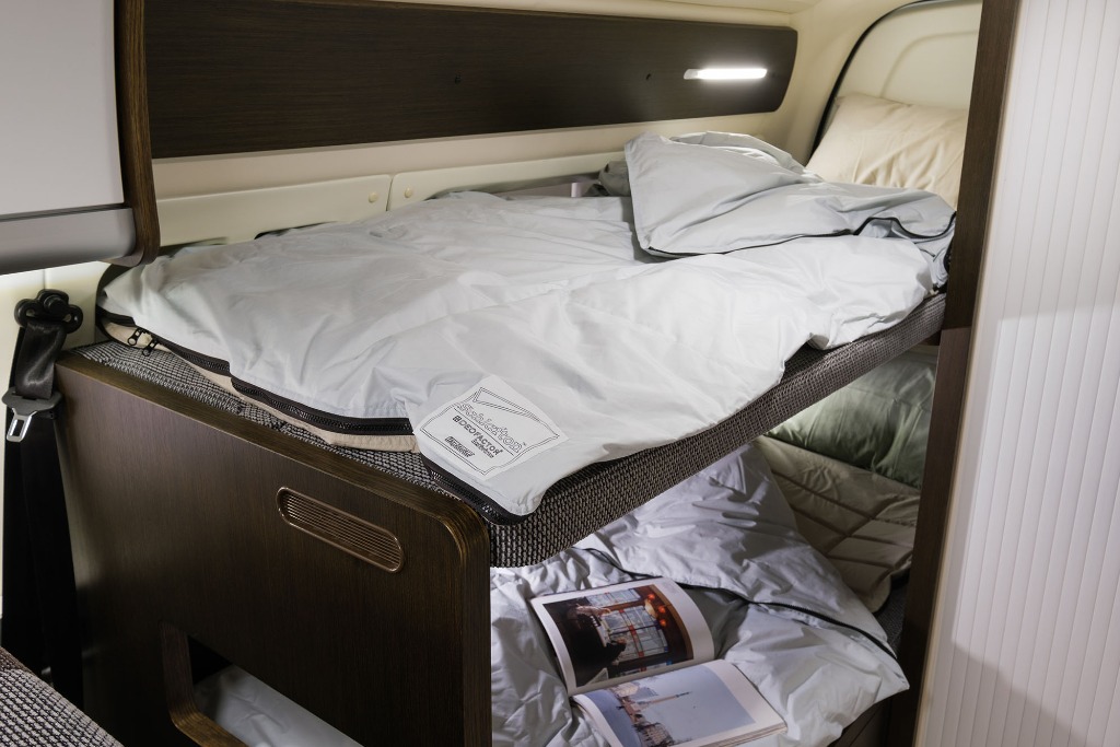 乗車人数は4人、就寝人数は2人ですが上段 L1,950 × 755mm、下段L1,950×W765mmの常設2段ベッドに加えて